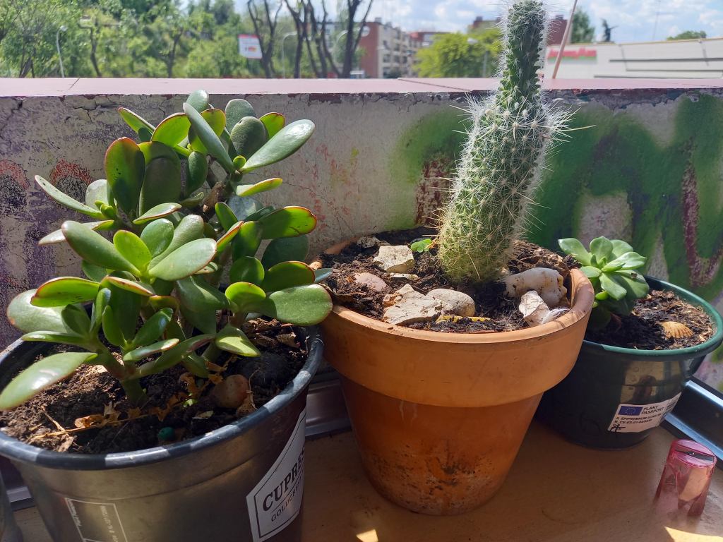 El sol comienza a calentar, en orden: geranios, azaleas, alegrías y cactus. Los que han sobrevivido a la gran nevada y algunos tiestos que rescatamos de la calle. Es lo mínimo que podemos hacer para cuidarnos, dedicarnos un rato cada día al cuidado de los seres verdes. Vivimos enfrente del Instituto donde fui a votar, el Gregorio Marañón. Tenemos el privilegio de ver cómo grupos de jóvenes pintan sus muros con grafitis muy chulos, que embellecen nuestras vistas.