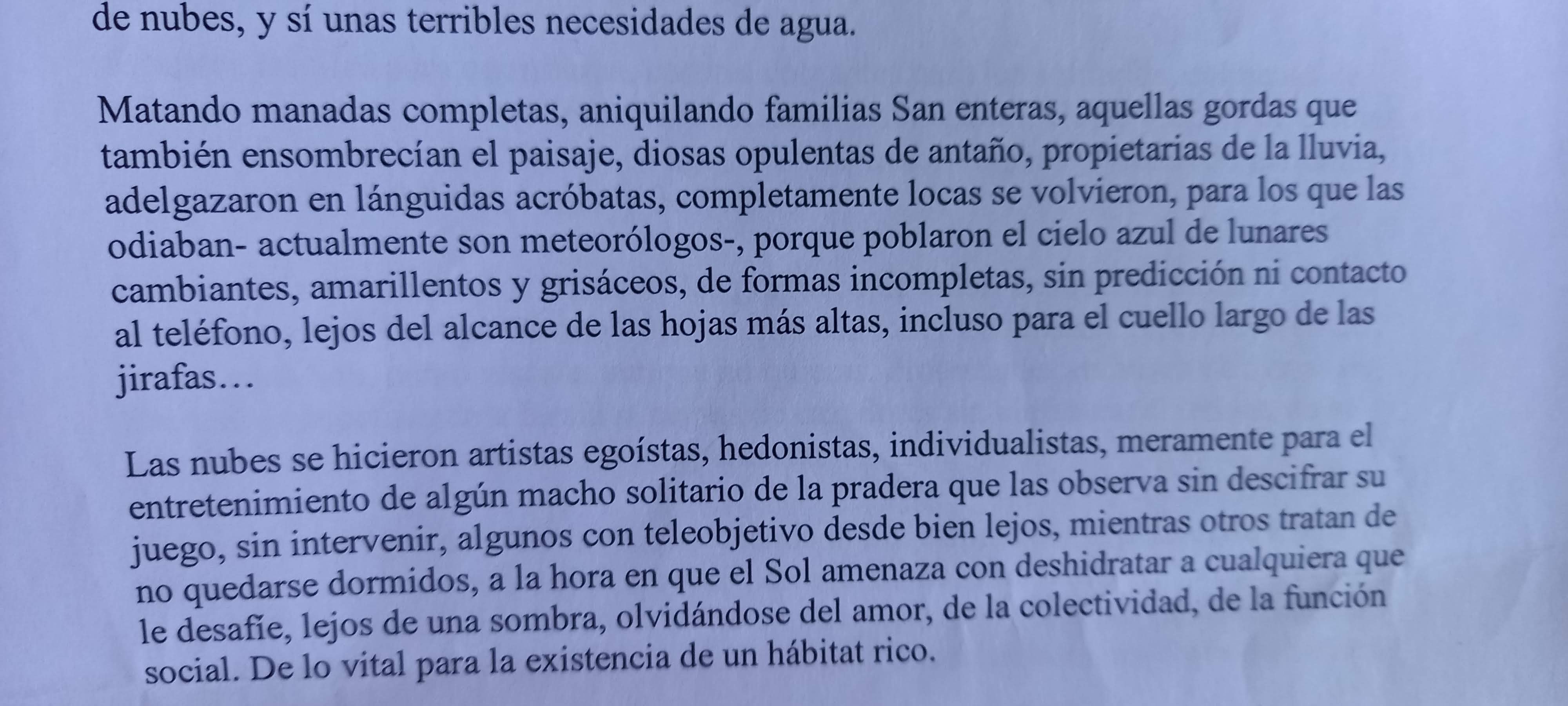 Pájaros piando, gacelas croando, jirafas en un trote desgarbado despavorido, bramando a las nubes.